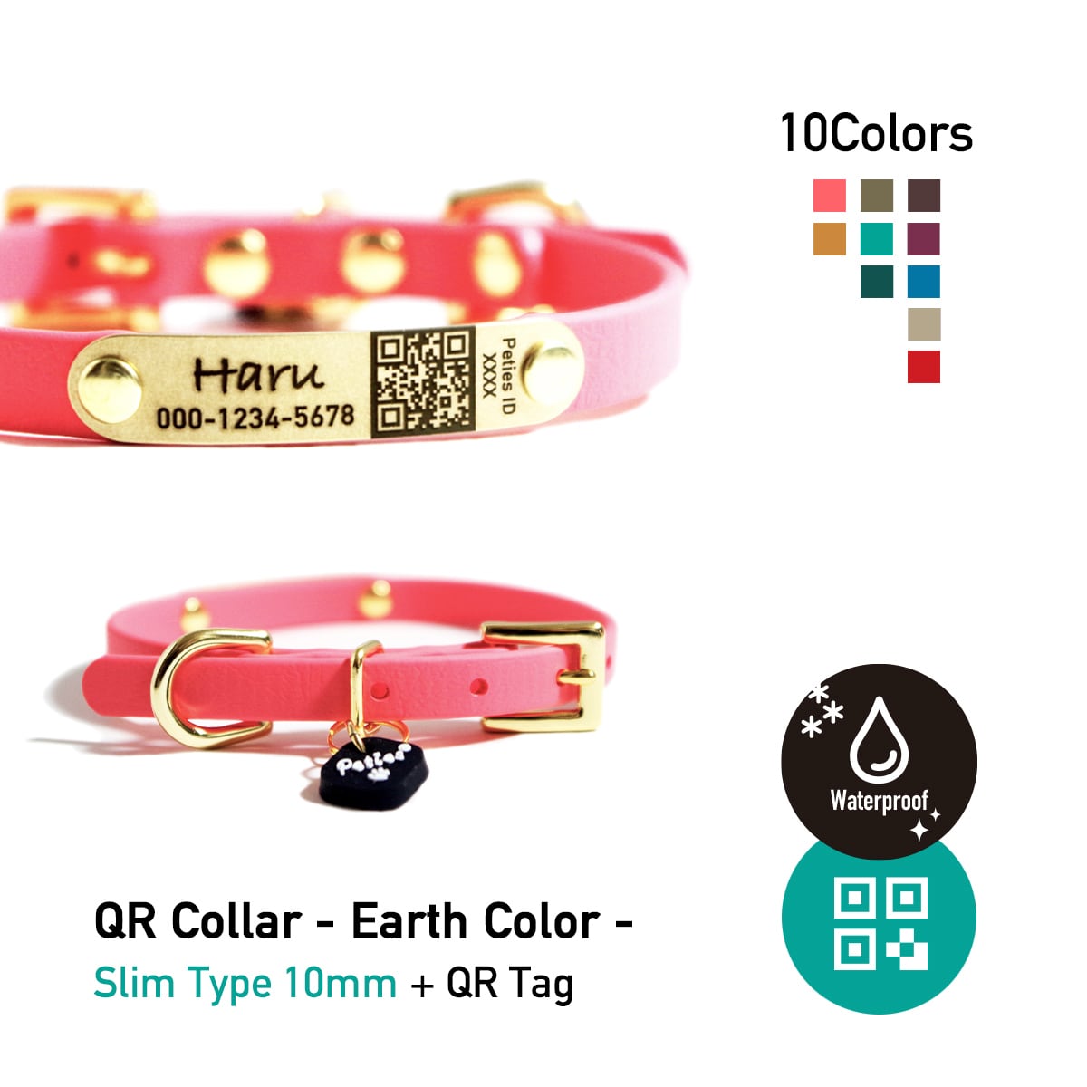 防水首輪 Biothane素材 EarthColor QRペットプロフィール 10mmスリム 小型犬向け